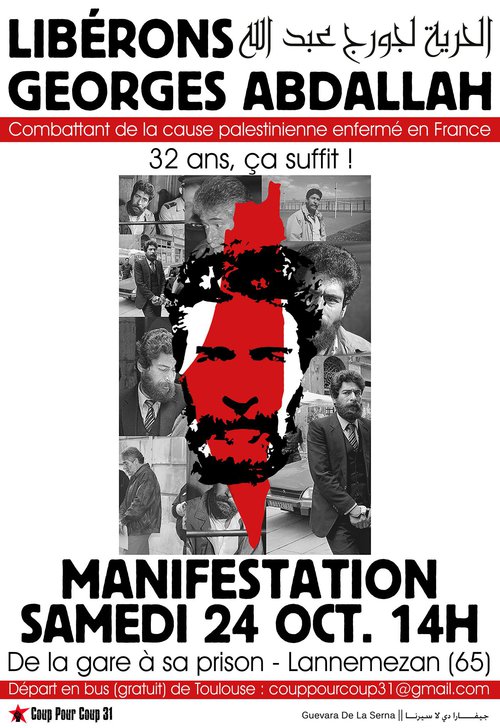 Premiers signataires : Action Antifasciste Marseille, Action Antifasciste NP2C, Action Antifasciste de Périgueux (24), Association Solidarité avec le Peuple Marocain (44), Bboykonsian, Breizhistance (Bretagne), CAPJPO-EuroPalestine, Collectif “Bassin minier” pour la libération de Georges Ibrahim Abdallah (62), Collectif Coup Pour Coup 31, Collectif Freedom For Palestine (Belfort), Collectif Libérons Georges Abdallah 33, Collectif Libérons Georges Abdallah PACA, Collectif pour la Libération de Georges Ibrahim Abdallah (Paris), Collectif Intifada (76), Collectif Nosotros (Marseille), Collectif Palestine 65 – AFPS, Collectif Palestine Libre (Toulouse), Collectif Palois pour la Libération de Georges Ibrahim Abdallah (64), Collectif Solidarité Palestine Annecy (74), Collectif de soutien à Georges Ibrahim Abdallah 34, Collectif de soutien à la résistance palestinienne (CSRP 59), Collectif Urgence Notre Police Assassine, Collectivo Palestina Rossa (Italie), Comité BDS France 42, Comité BDS France 66, Comité BDS France Toulouse, Comité Georges Abdallah Lyon/Sud Est, Comité « Libérez-les ! » (59 – 62) de soutien aux prisonniers et réfugiés politiques, Comité Solidarité Georges Abdallah Lille, Comité de Solidarité Tunisien pour la Libération de Georges Abdallah, Confédération Nationale du Travail-f, Coordination contre le Racisme et l’Islamophobie, CSAO Harraga (Lyon), Democracy and Class Struggle (Pays de Galles), Fronte Palestina (Italie), Front Uni des Immigrations et des Quartiers populaires (FUIQP), Génération Palestine, Gers-Palestine, GUPS Aix-Marseille, International League of People’s Struggle (ILPS), Jugendwiderstand (Allemagne), L’internationale, NPA, PCF Grenay, Quartiers Libres, OCML Voie Prolétarienne, Parti des Indigènes de la République, Popular Front for the Liberation of Palestine (Palestine), Première Ligne (93), Progressive Youth Organization of Kansas City (USA), Réseau “Noi Saremo Tutto” (Italie), Samidoun, Secours Rouge Arabe, Secours Rouge International, Rouge Vif 13, Solidaires Etudiant-e-s 31, Sortir du Colonialisme, Tjen Folket (Norvège), UJFP-Lille, Union Antifasciste Toulousaine, Unión do Povo Galego (Galice), Union Syndicale Solidaires.