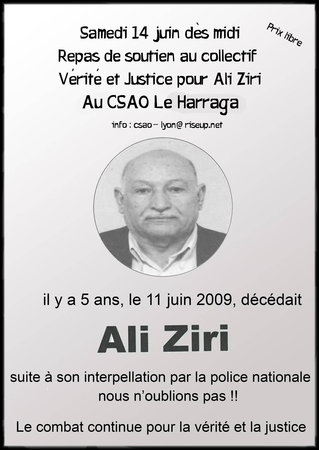 Pour soutenir nous aussi cette démarche, “le CSAO : Le Harraga” organise un repas à prix libre en soutien au collectif Vérité et Justice pour Ali Ziri le samedi 14 juin à partir de midi
